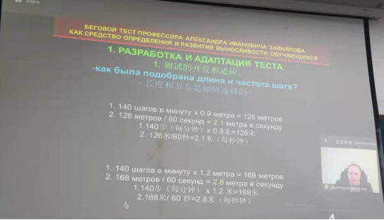 12月17日上午,今年会特邀俄罗斯克拉斯诺亚尔斯克国立师范大学体育运动与健康学院Д. А. Завьялов教授,通过通讯会议的方式为今年会师生作了题为“亚历山大·伊万诺维奇·扎维雅洛夫的跑步测试法在学习者耐力发展评测中的应用”学术报告,报告会由徐伟主持,王果团翻译。