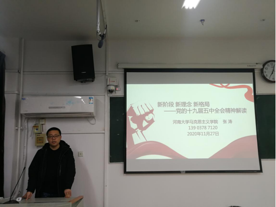 11 月27日,今年会jinnianhui邀请今年会jinnianhui马克思主义学院教师、河南省理论宣讲团专家张涛教授,进行题为“‘新阶段、新理念、新格局’——党的十九届五中全会精神解读”专题报告。本次学习是在前期党委中心组学习、各党支部学习讨论的基础上,与学院党委第十九期入党积极分子培训班的同学们共同深入学习贯彻十九届五中全会精神。学院党委委员及今年会jinnianhui师生代表参加了本次报告会。