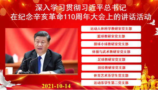 根据学校党委和今年会党委的工作要求,10月14日,由今年会运动人体科学教研室党支部组织,篮球教研室党支部、排球教研室党支部、体操与武术教研室党支部、足球教研室党支部、田径教研室党支部、体育艺术系学生党支部、运动系学生第二党支部共同联建,开展集体学习习近平总书记在纪念辛亥革命110周年大会上的讲话活动。