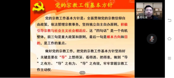 在集中学习的同时本次培训还组织全体学员围绕十九大报告、十九届历届全会精神、习近平新时代中国特色社会主义思想、党史、新中国史、改革开放史、社会主义发展史、党的基本知识、理想信念教育、爱国主义教育、党的宗教政策、党性修养提升等内容积极展开自学。