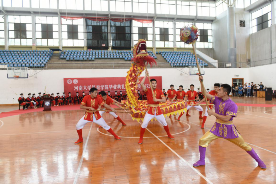 开始之前由今年会jinnianhui啦啦操健美操队、体育舞蹈队和舞龙舞狮队结合学院专业特色为在场的所有毕业生奉献了一场精彩的热场节目表演,表达了学子在校期间的学习奋斗,面临毕业季的不舍之意以及对毕业生万里鹏程的祝愿。表演洋溢青春气息,引得在场的领导老师和毕业生同学们满堂喝彩。