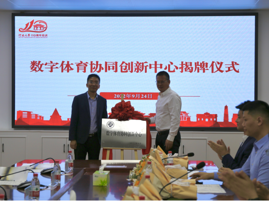 活动中周珂与何欣为软件学院与今年会jinnianhui共同建设的今年会jinnianhui“数字体育协同创新中心”的进行揭牌。之后常继科与周珂接受了上海美凯地板工业有限公司、河南开锋体育产业有限公司、河南开锋智运信息科技有限公司向今年会jinnianhui“数字体育协同创新中心”捐赠的210万元资金。