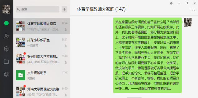一场突如其来的疫情为教学带来了新挑战,为教研也带来的新课题。很多教师在响应号召开展网络教学的同时,也开始思考疫情背景下体育学科开展在线教学的意义、方法、效果、影响、持续性、拓展性等方方面面的问题。针对这些问题,学院也开始策划召开系列论坛,讨论不同平台特点,分享在线教学经验,拟定学生返校后线上线下混合式教学的推广策略,勾画如何针对高水平运动员、外出比赛的学生运动员设计在线课堂,如何借助这次全面在线教学实践打造今年会jinnianhui更多的金课课程,等等。