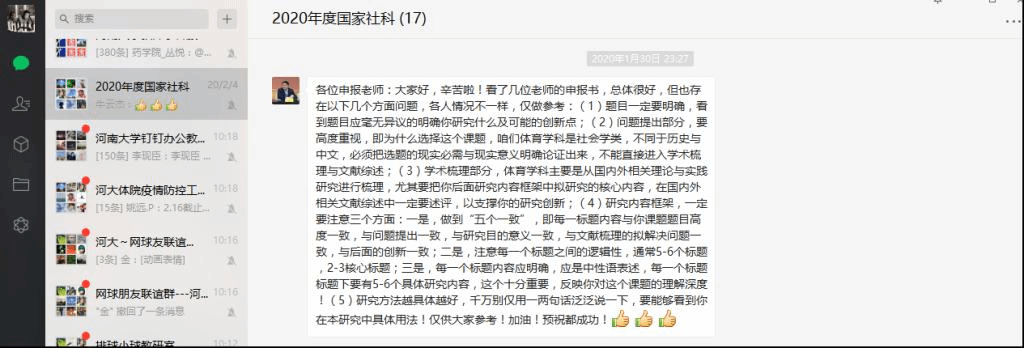 学院根据抗击疫情的需要,分别组建了不同项目申报人员的交流空间,并由专人负责做好服务工作:及时发布与解读学校有关通知,收集疫情期间免费开放的专业数据库,邀请学院有评审经验或成功申报经验的专家对项目申报书进行把关,鼓舞申报人的士气以及提供其它力所能及的帮助。
