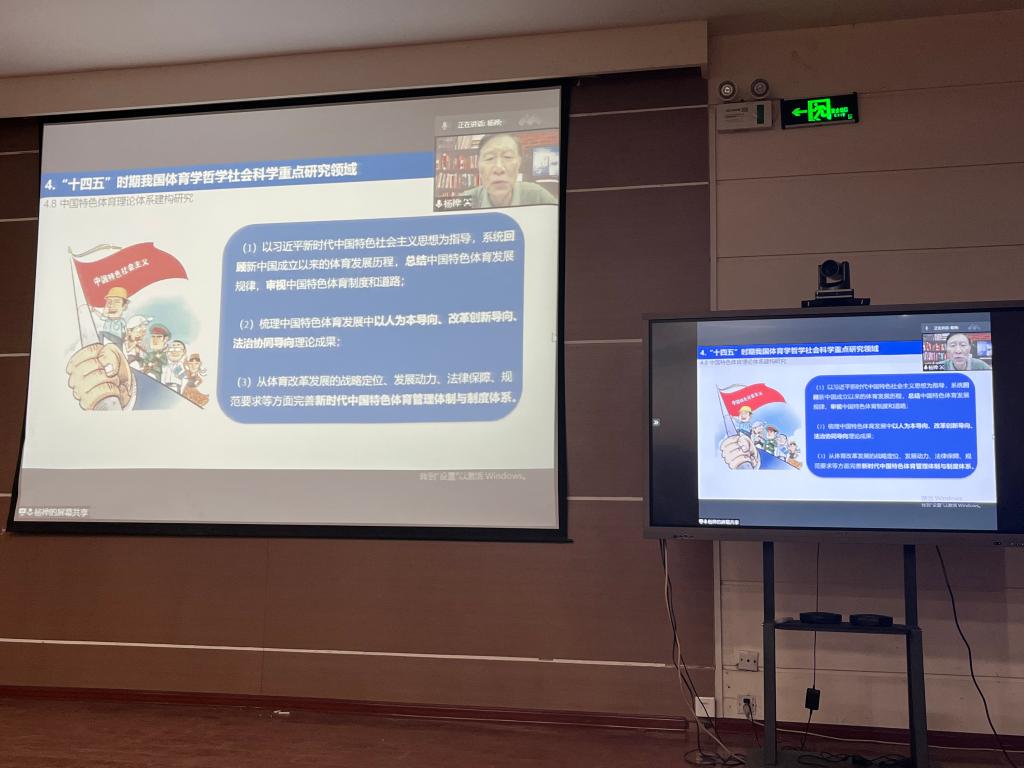 学术报告的主题为“新时代我国体育哲学社会科学的研究现状与发展趋势”,报告主要对“十三五”期间体育哲学社会科学的研究状况和存在问题进行高度凝练,并借此引出“十四五”时期我国体育学哲学社会科学的前沿问题及发展趋势,指出了当前一段时期重点研究的领域。