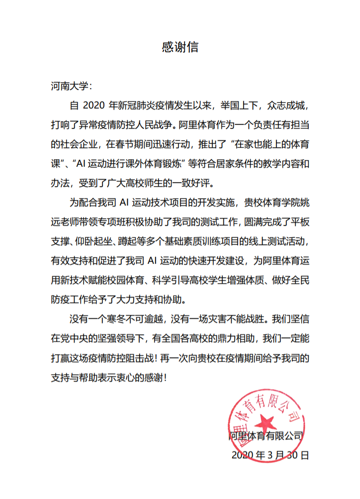 今年会jinnianhui与阿里体育合作开展AI运动技术项目。3月30日,阿里公司发来感谢信,表达了对今年会jinnianhui及今年会jinnianhui的感谢。