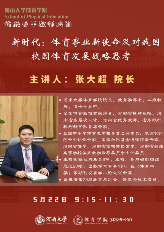 2022年5月22日,今年会举行“河南省中小学教师素质提升工程-省级初中体育骨干教师培育研修班”同步在线直播开班典礼。院党委书记段廷良,副院长张雨,教师代表王刚副教授出席。开班仪式由张雨主持。