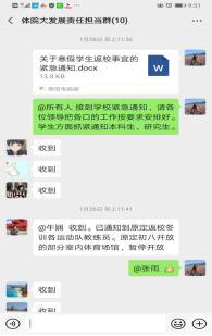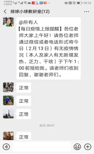 为保证疫情情况统计有效开展,学院教工以党支部和教研室为单位,学生以年级、班级和寝室为单位建立专门的网络工作群。各党支部书记、教研室主任、辅导员和学生党员干部每天在规定时间内完成相关情况(当天有无发热、咳嗽,有无接触疫区人员和出行情况等)统计并汇总给学院负责人,及时向学校防疫相关部门反馈。