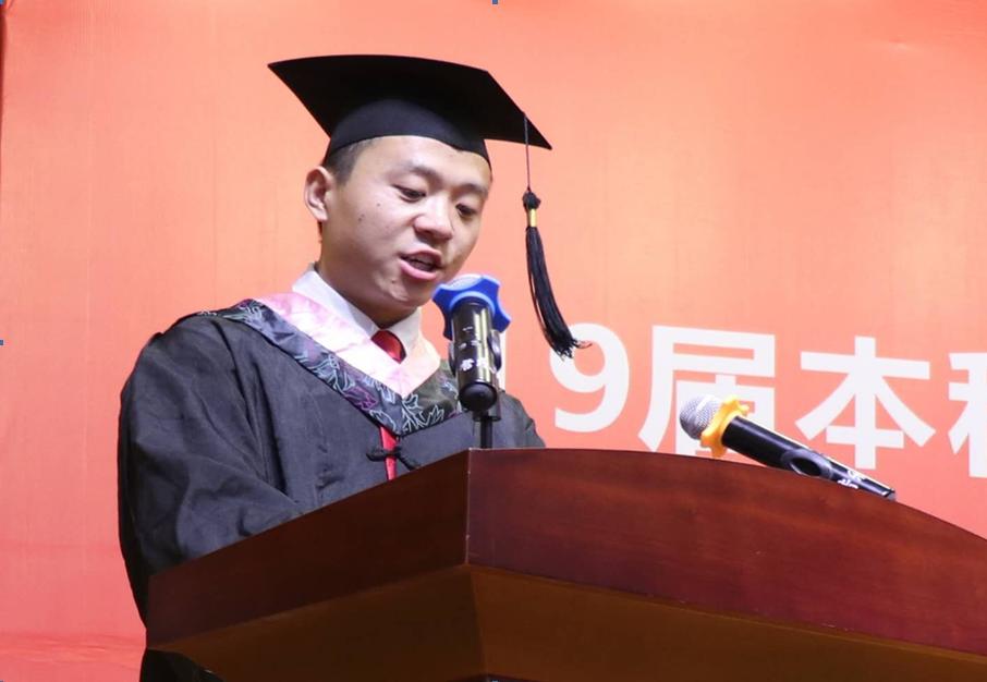 毕业生代表王紫云表达了对学院老师辛勤培育的感谢,并深情回忆了四年来青春里的点点滴滴,表达了离别时的依依不舍。他表示,作为一名大学生,作为一名体育人,知识水平固然重要,但比起它更重要的应该是我们面对困难时的信心与勇气、面对打击时的决心与豪气、面对诱惑时的坚定与侠气!