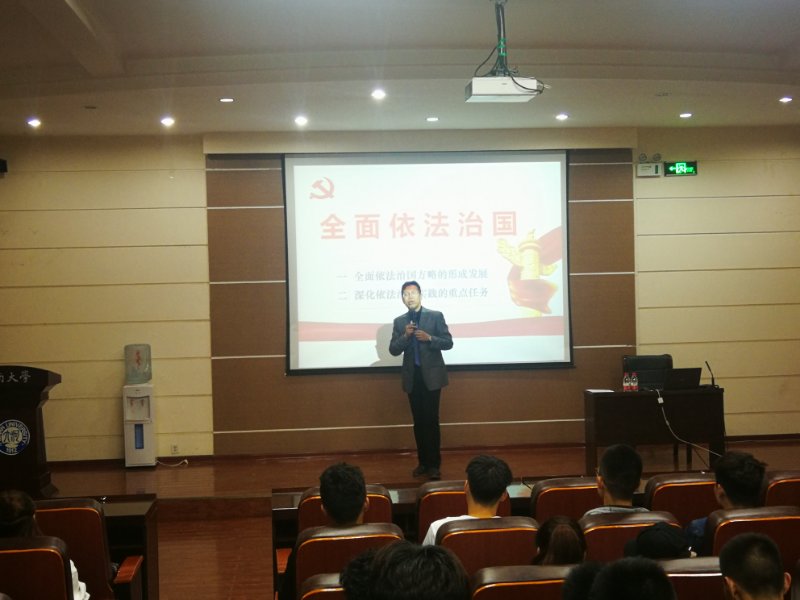 刘嘉尧副教授围绕新时代中国特色社会主义背景下“依法治国”为主题,结合当代大学生的角色定位为同学们带来生动的讲解。从危害国家安全的案例讲起,强调了新形势下坚持总体国家安全观的重要意义,分析新形势下国家安全面临的压力和风险,向大家讲述总体国家安全观的丰富内涵。