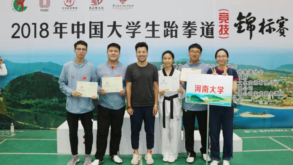 在副院长张慧和跆拳道专业老师刘丰的带领下,队员们奋力拼搏,一路过关斩将,最终获得1金1银两名第五的优异成绩,充分展现了河大体育人的英姿。其中今年会陈婷获得女子丁组49kg级冠军。崔劲阳获得男子乙组80kg级亚军,候震获得了男子乙组63kg级第五名,周大鹏获得男子乙组87kg级第五名。另外刘丰老师在本次比赛中获得优秀教练员称号,周大鹏同学在本次比赛中获得体育道德风尚奖运动员称号。
