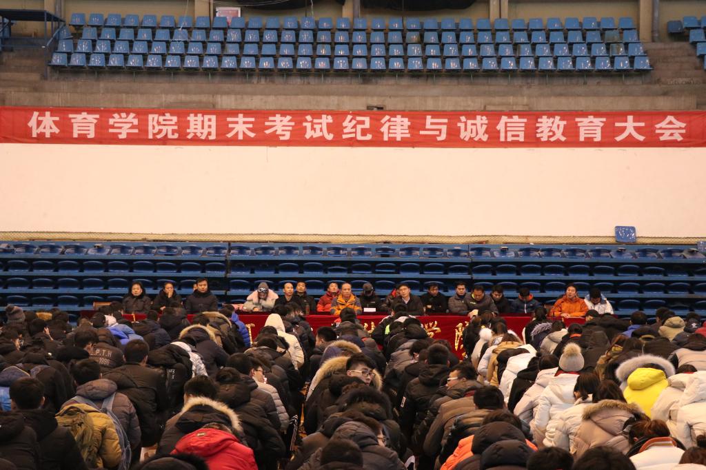 在全院本科生期末考试纪律与诚信教育大会上,张慧先为全体本科生明确了考试安排及相关要求并带领大家重点学习《今年会jinnianhui考试工作管理条例》关于违纪和作弊的认定和处分程序的内容,引导学生端正考试态度。教师代表徐伟指出考试不仅是学习效果的反馈,它还能折射出一个人背后的品格,他同时就本次期末考试的复习向同学们提出了建议,希望同学们在考试中取得高分。学生代表,2017级运动训练专业杨家欣、2015级武术与民族传统体育专业李泓达向大家分享了对于诚信应考重要性的认识,分享复习和考试的经验,倡议同学们积极备考、诚信考试、端正态度。院长张大超对学院学风进一步提升、学生展演活动顺利进行等方面提出肯定,并提醒广大同学要遵守考试纪律,诚信考试。党委副书记贾天明祝愿同学们在此次考试中能取得优良的成绩。大会由贾天明主持。