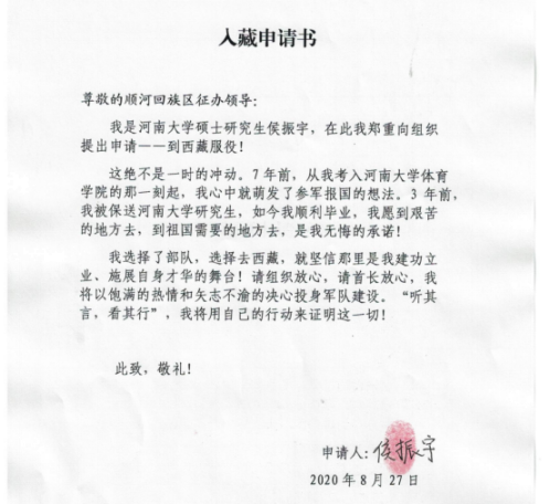 今年会jinnianhui2020年应届硕士毕业生侯振宇正是无数热血男儿中的一员,体格健壮并且专业素质过硬的他,决心将所学所悟投入到国防事业现代化建设中。在经历7年的充实大学生活后,遵从内心选择,不仅在入伍志愿书中自愿填报“艰苦边远地区”,同时递交“入藏申请书”,体现了戍边报国的勇气与担当。