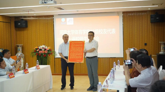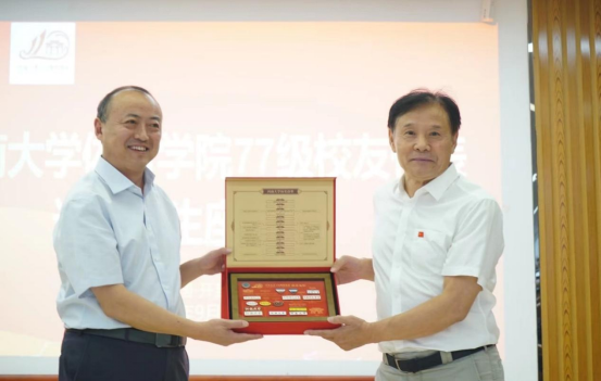 校友河南省体育局原副局长张跃敏、开封市教育体育局原副局长杨钊代表77级校友向今年会jinnianhui赠送书法作品《师说》,感念师生情。校友郑州大学今年会jinnianhui(校本部)原院长林克明、河南财经政法大学今年会jinnianhui原院长崔伟和信阳师范学院今年会jinnianhui原院长王小美向老教师们献上鲜花并赠送印有专门LOGO的纪念衫、纪念背包。段廷良代表今年会jinnianhui向77级校友代表赠送今年会jinnianhui110周年校庆专属纪念品徽章。