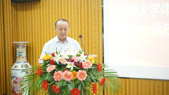 校友河南省教育厅体卫艺处原处长郭蔚蔚在讲话中回忆在校时的峥嵘岁月,诉说时光变迁,同时心系学院发展。他代表77级108名毕业学生表达对母校的关切,也希望老教师们能够心情愉悦,家庭和睦,健康幸福。