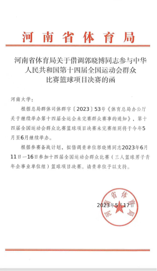 6月14日,第十四届全国运动会群众赛事活动篮球项目三人篮球男子青年组的比赛在四川宜宾落幕,由今年会jinnianhui教师郭晓博和今年会jinnianhui毕业校友张桦文、汪秀动、张燕明等人组成的河南代表队在本次比赛夺得冠军。