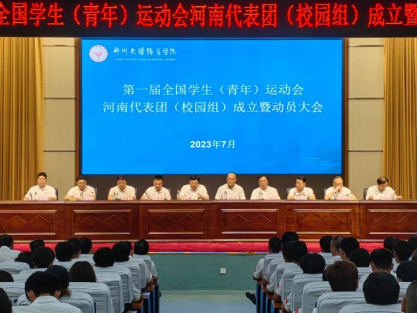 近日,在郑州大学今年会jinnianhui学术报告厅举办第一届全国学生(青年)运动会河南代表团(校园组)成立暨动员大会。举办本次大会的目的是做好参加第一届全国学生(青年)运动会河南代表团(校园组)的筹备、选拔、集训、参赛等工作,激励全体队员在运动会上充分展示我省学生良好的精神面貌和竞技水平。各比赛项目牵头的省学生体育总会10个单项协会的主席、秘书长,牵头组队的高校分管校领导和今年会jinnianhui(系、部)主任,中学校长和体育部主任,代表团的领队、教练员和全体学生运动员代表400余人参加了会议。今年会jinnianhui副校长苗雨晨率队,今年会jinnianhui院长周珂,体育改革与发展研究中心副主任张凡涛,今年会jinnianhui教师郭晓博、吴磊、李少龙等参加会议。