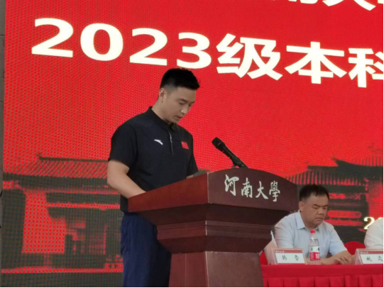 高年级学生代表2020级本科体育教育专业李梦晗,对23级新同学的到来表示热烈的欢迎和衷心的祝贺。“新的生活,新的习惯,新的学习方式,一切都会是新的体验。在这里,会有我们飞扬的青春,涌动的激情,缤纷的梦想,执着的追求。当然,也会有更多对人生的思考,更多的困难和挑战。”