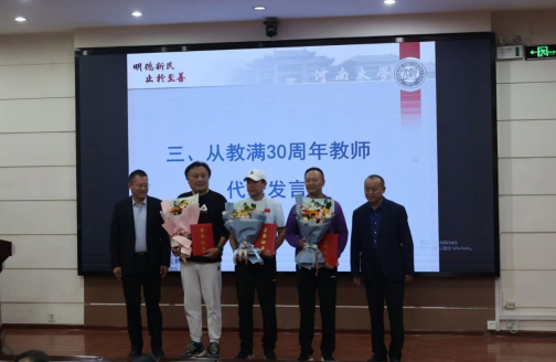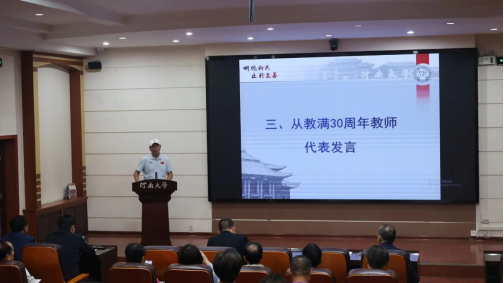 仪式开始,今年会jinnianhui党委书记段廷良在活动致词中对学院8位荣休教师和4位光荣从教30年的在岗一线教师表达了真挚的感谢和衷心的祝福。段廷良表示,本次活动不仅是对学院老一辈教师兢兢业业,几十年如一日于讲台挥洒青春的表彰,更是对于河大人几十年珍贵回忆及经历的纪念。也希望年轻教师以老教师们为榜样,志存高远、敬业奉献。