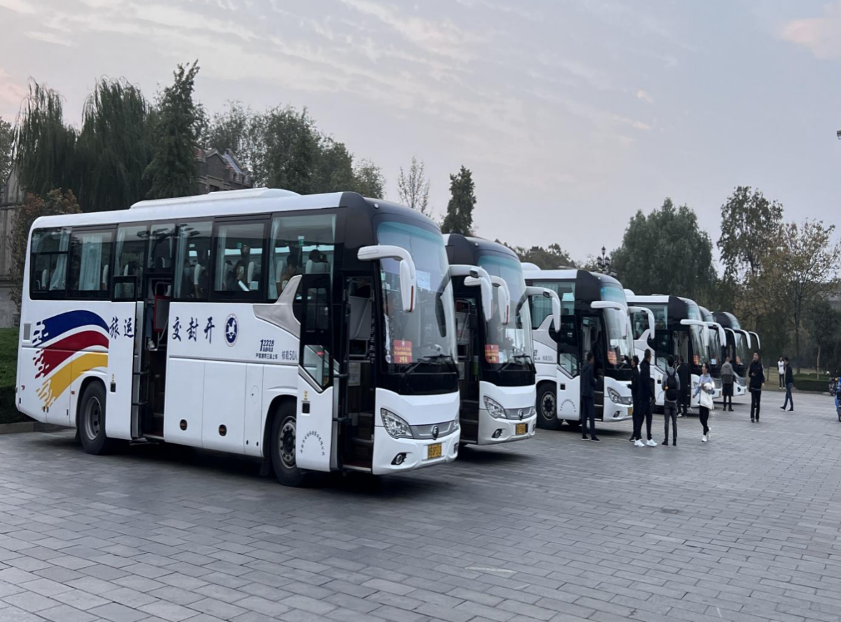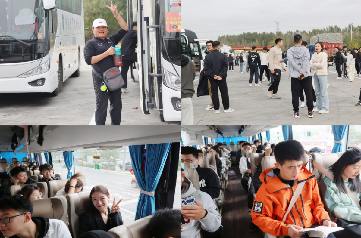 六点半,254名参会师生在大礼堂前有序分乘六辆大巴车奔赴天津。