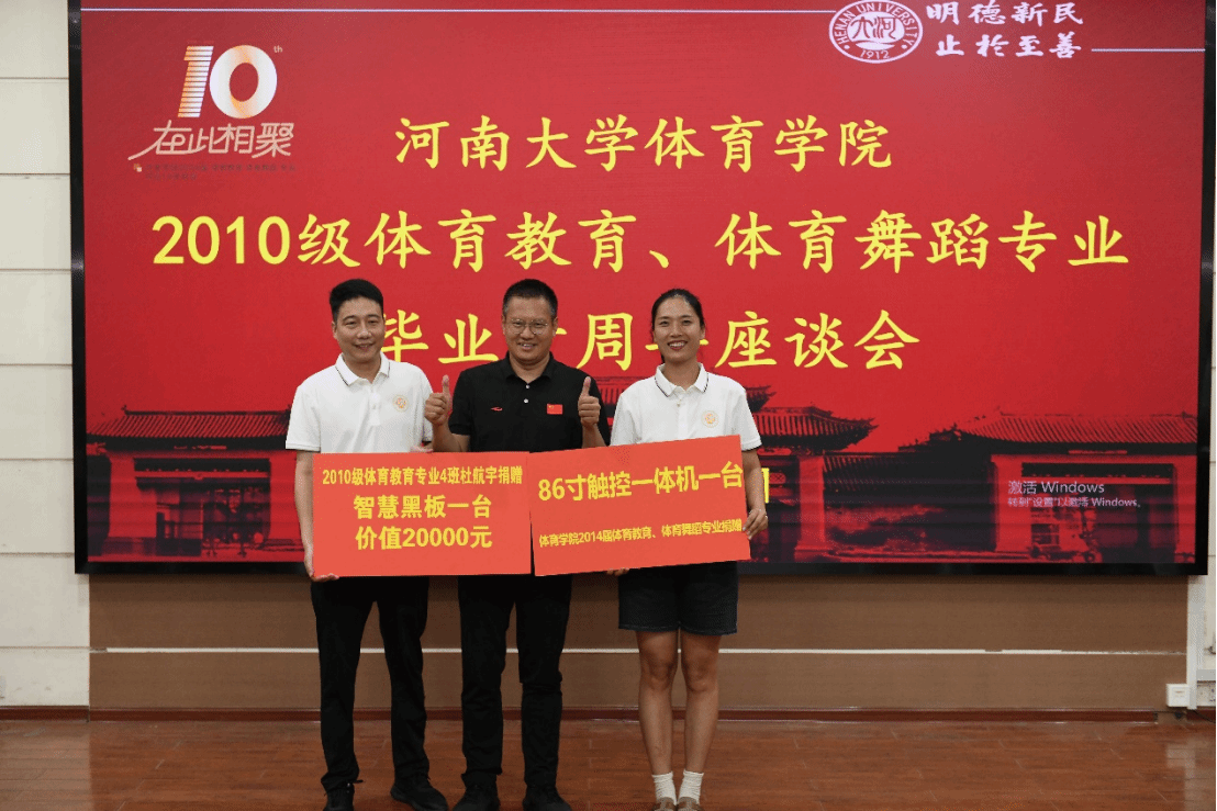 明德新民,止于至善,饮水思源,感恩母校。为反哺母校,感谢母校的培育之恩,助力母校建设发展,董子萌、杜航宇作为2014届体育教育、体育舞蹈专业毕业生代表向学院捐赠86寸触控一体机和智慧黑板各一台,周珂代表学院接受捐赠。