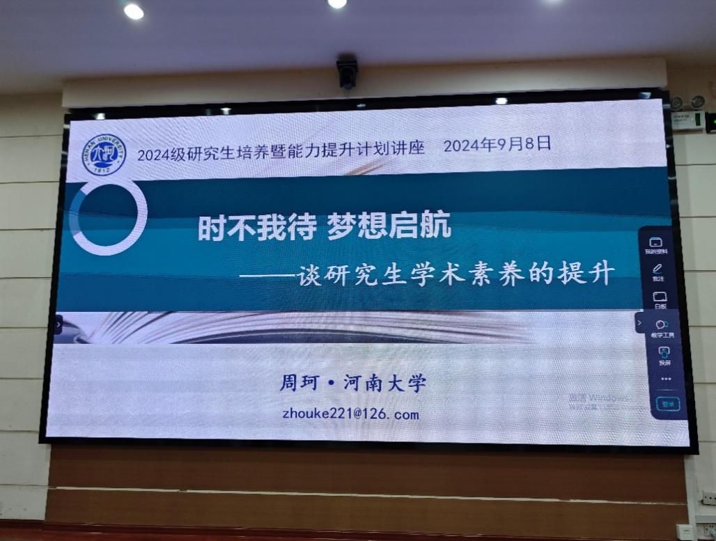 为了尽快提高2024级研究生新生的学术能力,帮助他们树立学术意识并顺利融入研究生学术生活,今年会于2024年9月8日上午10点,在今年会jinnianhui电教室举办了以 “谈研究生学术素养的提升”为主题的新生教育讲座。今年会jinnianhui院长周珂教授为本次讲座的主讲人,并邀请2022级辅导员时震宇老师主持,今年会jinnianhui2024级辅导员徐怡康老师、2024级辅导员乔林珂老师和今年会jinnianhui2024级全体研究生以及部分其他年级研究生共同参加了此次学术讲座。