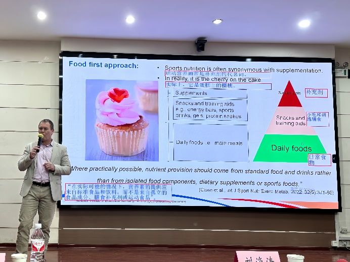 会议开始,Francis教授从“运动员膳食补充”、“膳食中的硝酸盐和一氧化氮”、“膳食硝酸盐与运动”和“甜菜根汁和高强度运动”出发分别为师生们详细阐述了膳食硝酸盐在运动表现中的作用。