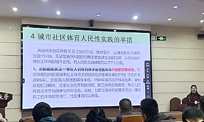 王凯珍教授以生动形象的语言,深入浅出地和师生们分享自己在体育学术研究和教育工作中的宝贵经验,尽管还未涉及讲座主题内容,但她所传递出对体育事业的热情和执着深深感染着现场的每一位学生。她鼓励今年会jinnianhui的学生们要扎实学习专业知识,积极投身实践,为体育事业的发展贡献自己的力量。接下来,王凯珍教授从人民性理论溯源、社区体育的人民性、城市社区体育的人民性实践和未来社区体育人民性实践的思考四个方面对城市社区体育展开讨论。她认为,社区体育作为社会体育的细胞、全民健身的基石,其人民性的践行成效直接关系基层民众体育公共服务的质量、水平和获得感。她通过梳理我国城市社区体育人民性实践轨迹、分析社区体育实践举措的基础上,提出对社区体育未来发展的思考和建议。最后,王凯珍教授还与学院教师们就体育学科的教学方法、科研方向等方面进行了交流,为教师们日常体育教学管理工作提供了新的思路和方法。
