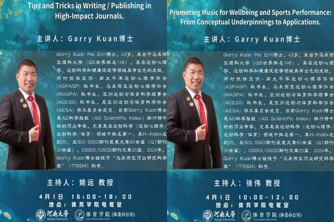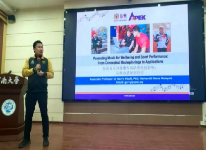 讲座开始,Garry Kuan教授以“促进音乐对健康和运动表现的影响”为题,围绕音乐与体育的关系、音乐对运动表现有益的影响和如何选择正确的音乐等一系列问题进行了深入细致的讲解与探讨,表示运动员听对的音乐可以降低他们的压力,更好的调节身体节奏和情感,减少焦虑、抑郁和痛苦等现象。指出选择符合个人和团队活动特点的音乐,可以在体育和运动中对表现提升和动机产生显著影响。
