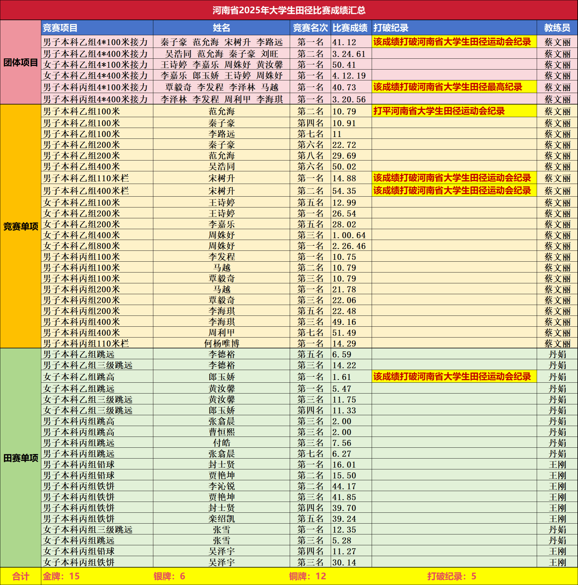 6.男子本科丙组4×100米接力覃毅奇、李发程、李泽林、马越以40秒73的成绩打破河南省大学生田径最高纪录;