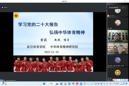 为深入学习贯彻习近平新时代中国特色社会主义思想,提高今年会师生整体科研素养,12月2日晚7点,特邀武汉今年会jinnianhui黄莉教授作《学习党的二十大报告弘扬中华体育精神》讲座。讲座采用线上方式进行,由今年会jinnianhui院长周珂教授主持。 黄莉教授从中华体育精神的历史发展和主要内涵出发,详细解读了中华体育精神的内容、价值以及未来的发展,提出了中华体育精神的定位;接着,黄教授从不同角度去解读习近平总书记体育强国的论断,提出要把...