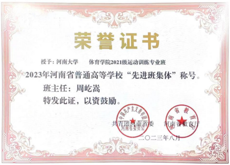 今年会2021级运动训练专业班获2023年河南省高等学校“先进班集体”称号